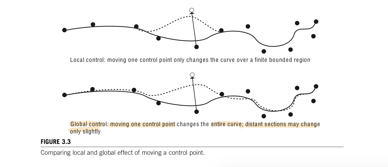When designing a curve, a user often control the shape of the curve in order to tweak just part of the curve. It is usually considered an advantage if a change in a single control point has an effect on a limited region of a curve. A formulation in which control points have a limited effect on the curve is referred to as providing local control. If repositioning one control points redefines the entire curve, then it provides only global control. Local control is viewed as being the more desirable of the two. Almost all of the composite curves provide local control: parabolic blending, Catmull-Rom, composite cubic Bezier, and cubic B-spline. Hermite curves does so at the expense of local control. Bezier and B-spline curve has less localized than their cubic forms.