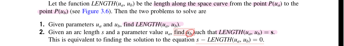 Notice that a function is desired that relates time to a position on the space curve. The user supplies the distance-time function that relates time to the distance traveled along the curve. The distance along a curve is defined as arc length, denoted by s. Then s=S(u) is used. If the arc length computation is specified as a function of time, then S(t) is used(if we use time t as a parametric value). The function of arc length that computes a parametric value is specified as u=U(s)(compute the parametric value for example time t, based on the arc length data).