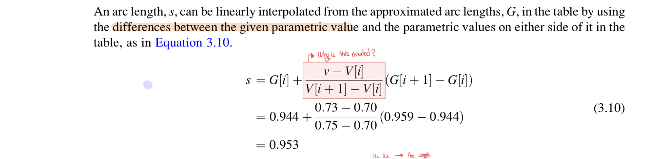 For example, if the task is to estimate the location of the point on the curve that is 0.75 unit of arc length from the beginning of the curve , the table is searched for the entry whose arc length is closest to that value. In this case, the closest arc length is 0.72 and the corresponding parametric value is 0.40. The values in the table that are on either side of the given distance are used to linearly interpolate a parametric value. The value of 0.75 is three-eights of the way between 0.72 and 0.80.